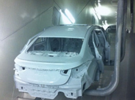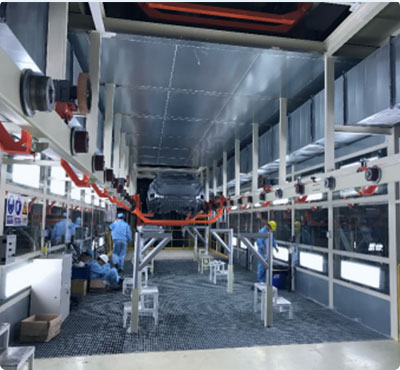 乘用车输送设备分为前处理电泳输送设备和后处理输送设备 前处理电泳输送设备分为翻转输送机、双摆杆输送机、积放链输送机和自行葫芦输送机。 积放链、摆杆链和翻转机适用于产能20-80JPH涂装生产线。 乘用车输送设备