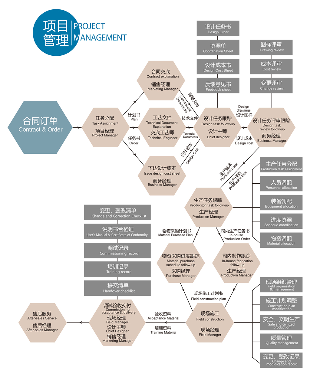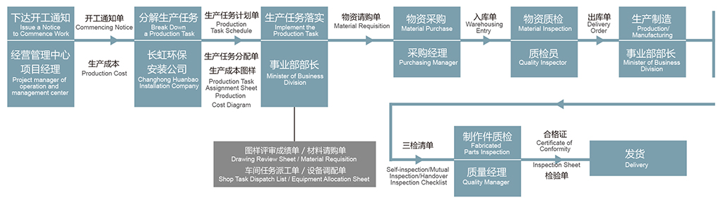 综合管理部下达生产书至各专业事业部时,同时提供全套设备制造图和生产预算,对生产任务的安全、愿量、进度和成本等提出明确的要求,并全程监督。