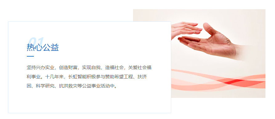 在经济全球化的今天,长虹智能重视并切实履行社会责任,不断服务社会,回报社会,把履行社会责任作为巩固、提升品牌形象和贯彻企业文化的重要途径,让社会责任感成为鞭策和激励企业发展的源动力。